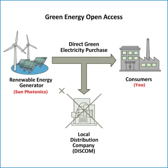 Green Open Access allows eligible consumers to buy renewable power directly from generators using the existing transmission and distribution network. Instead of relying entirely on the local discom’s conventional mix, consumers can contract solar, wind, or hybrid projects located anywhere in the country (subject to regulations) and receive energy through the grid.